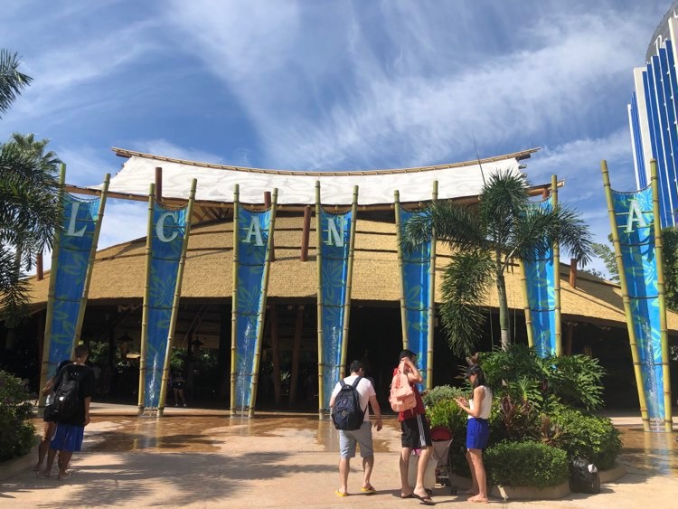 To get to Volcano Bay is certainly a unique journey! From the Uber drop off area at the top of the parking garage, you'd walk down to the bus stations to get a bus to Volcano Bay. The water park really is off the beaten track, as we walked through a tunnel to go up a set of escalators, meandered through some themed pathways and onto the entrance of Volcano Bay for our very first visit.